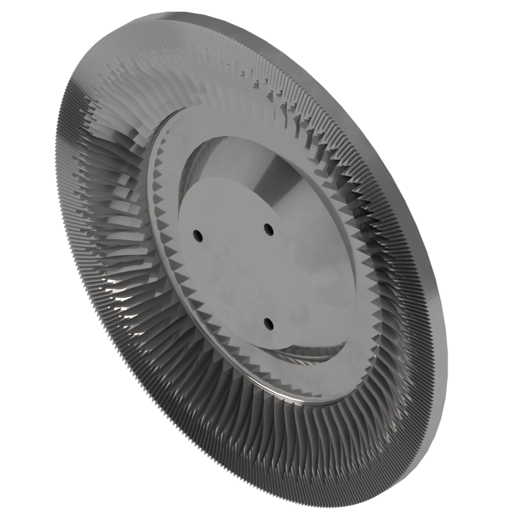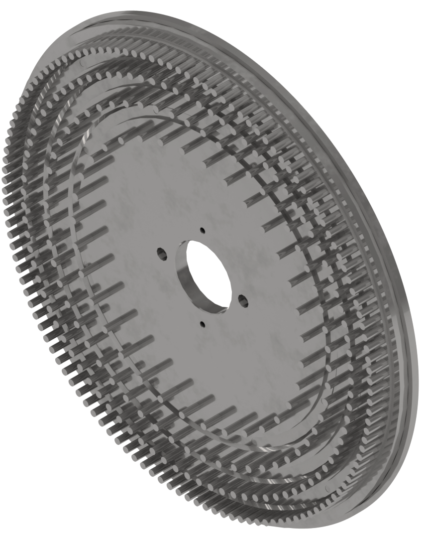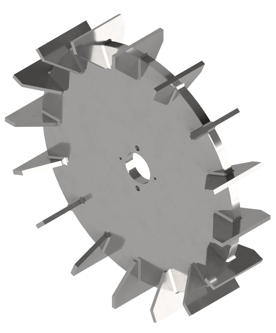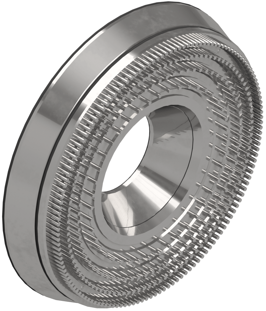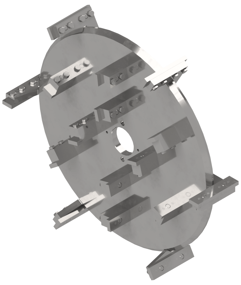 Der Riffelscheibenrotor besteht aus einer Scheibe, auf der mehrere Riffelsegmente angebracht sind. Diese sind mit einer riffelartigen Profilierung versehen, die in ihrer Ausrichtung der Profilierung des Riffelscheibenstators entgegengesetzt ist. Zwischen diesen Profilierungen wird das Mahlgut mit Scherbeanspruchung zerkleinert.