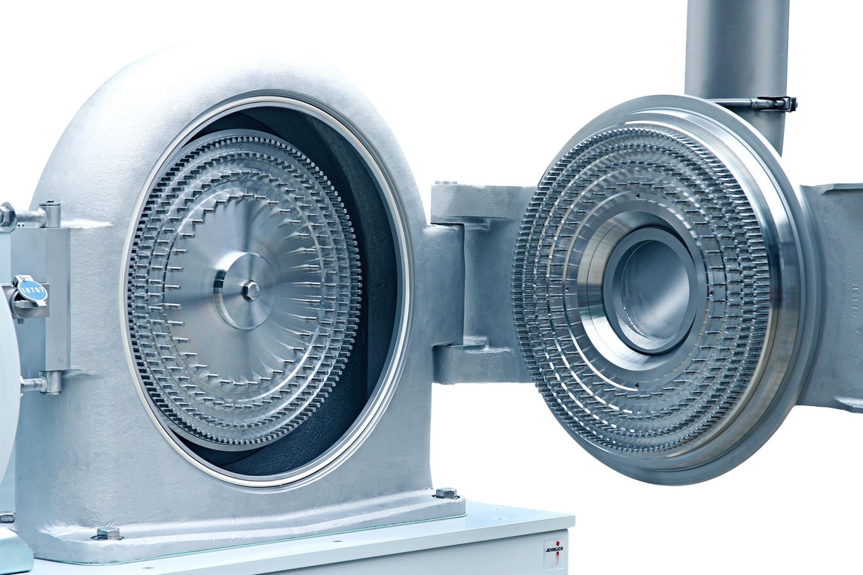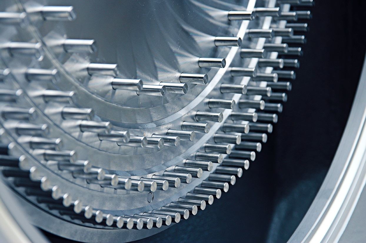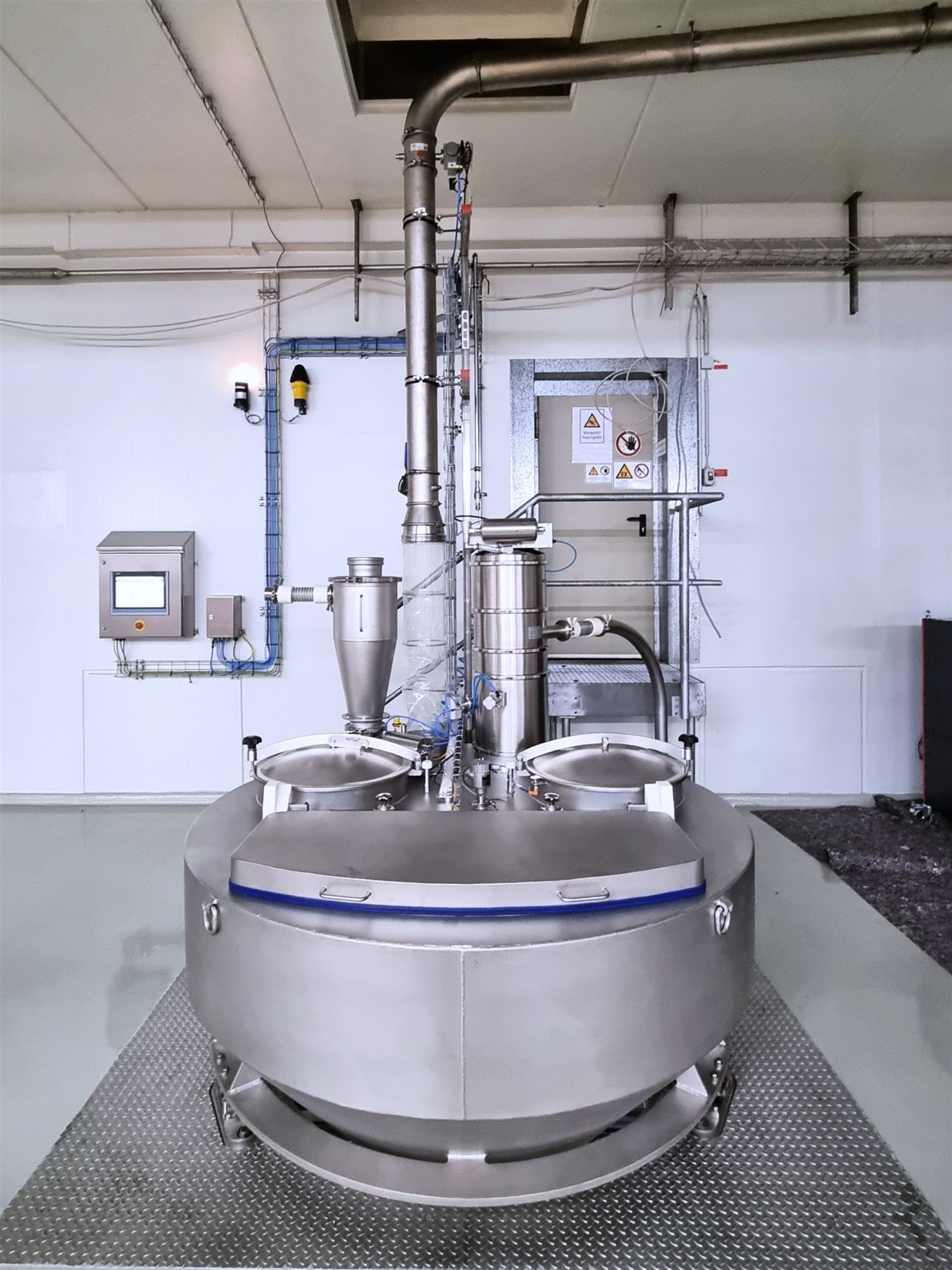 Die Überkornvermahlung wird von einer Feinprallmühle REKORD C-2SSt mit drehzahlvariablem Antrieb. Als Mahlelemente kommen Stiftscheiben zum Einsatz, die von einem Allmetallabscheider vor unerwünschten Fremdkörpern geschützt werden. Durch integrierte Mahlluftkonditionierung kann die Vermahlung, in Abhängigkeit der Produkteigenschaften des Aufgabematerials, auch mit reduzierter Mahllufttemperatur erfolgen.