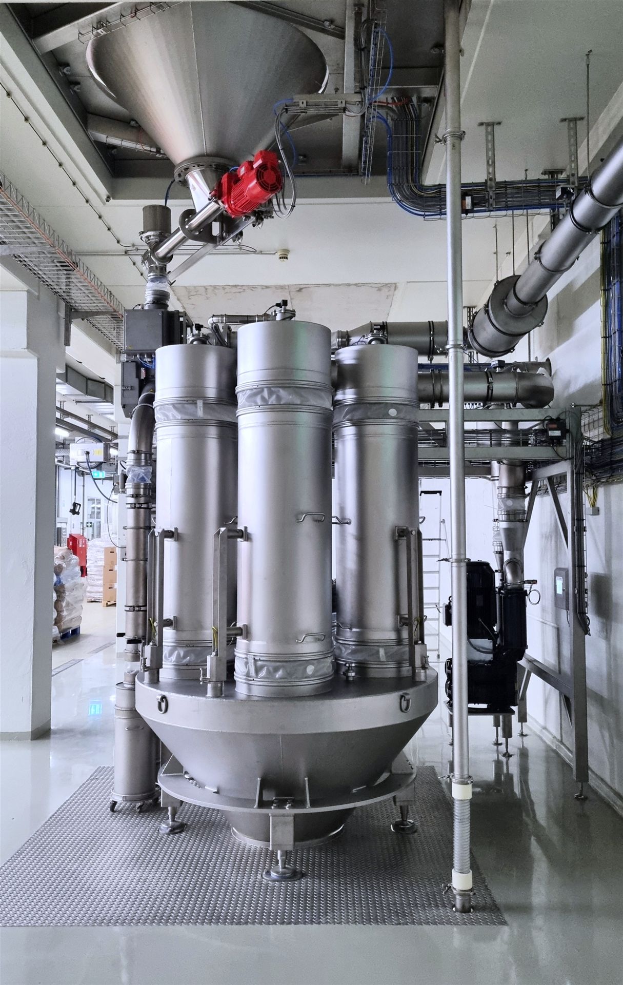 Ein Filter-Abscheider mit effizienter Pulse-JET-Druckluftabreinigung dient der Entstaubung des pneumatischen Förderstroms.