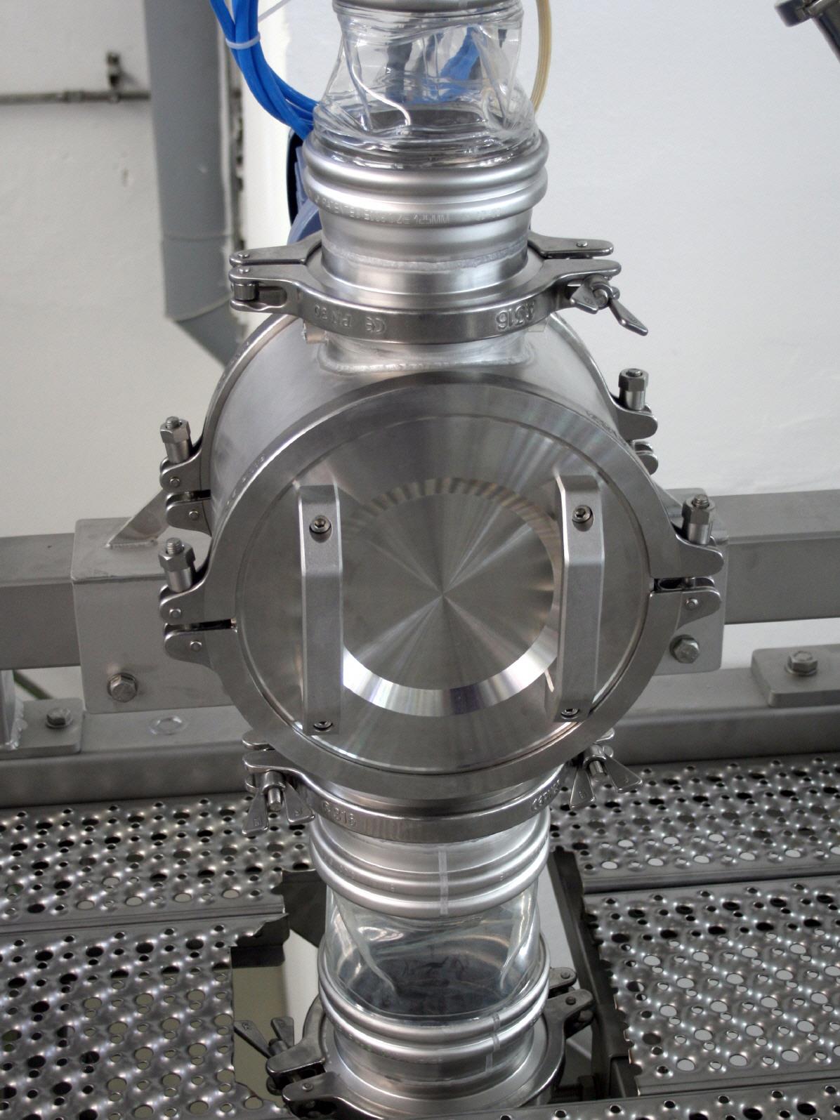 Die Ausführung erfolgt in Edelstahl 1.4404 mit FDA-konformen Dichtwerkstoffen, einer neuentwickelten doppelten Wellendichtung mit Sperrgasunterstützung, GMP-gerechte Konstruktion und produktberührende Oberflächen in Ra ≤ 0,8 µm. Die Zellenradschleuse ist über 2 Spannringe komplett demontierbar und somit eine leichte Reinigung möglich.