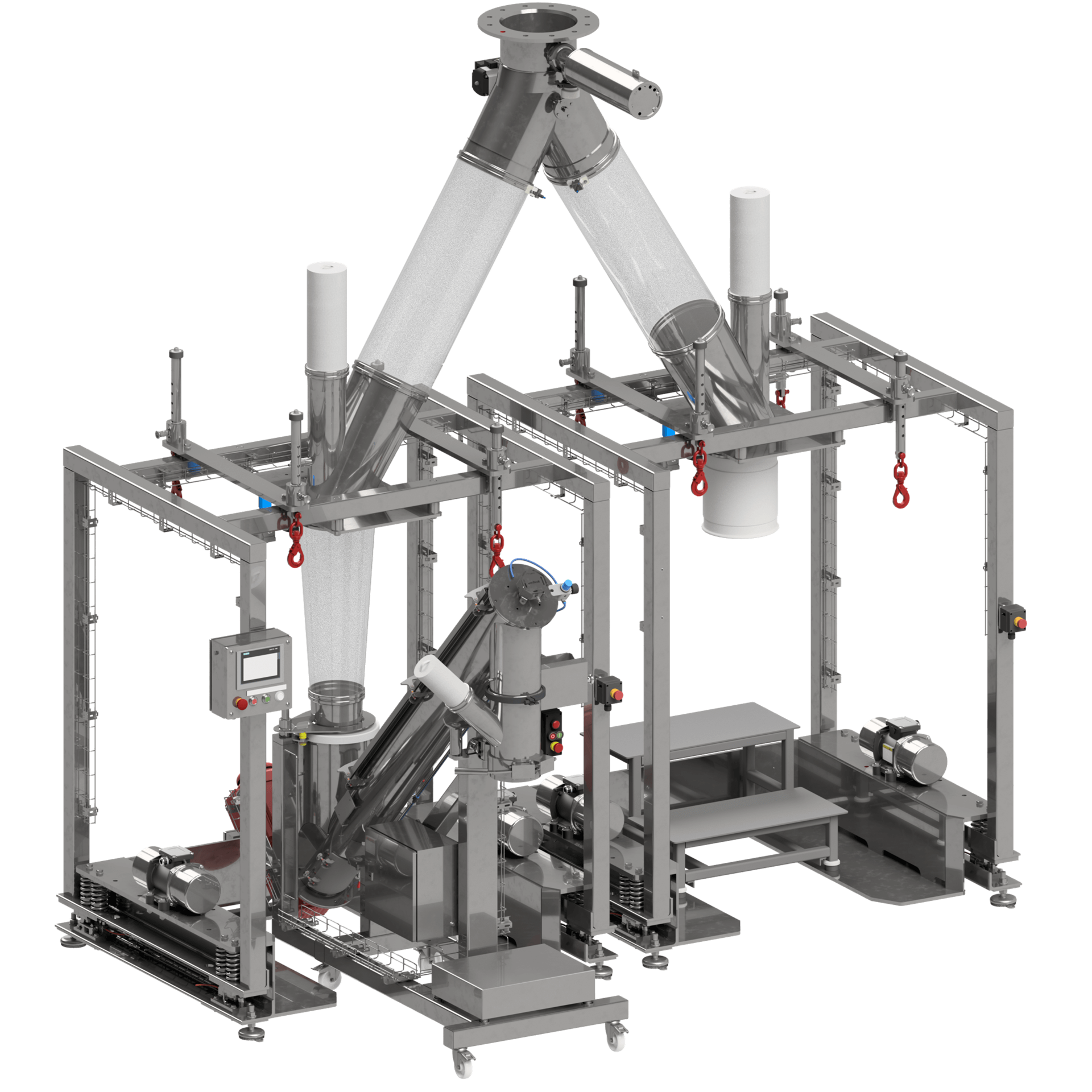 The Big Bag Filling Station enables dust-free filling of big bags. An optional vibration frame ensures optimum filling to avoid the formation of bulk cones. The required big bag filling can be defined by the weighing system. The big bag filling spout is connected using either an inflatable clamp or a one-handed bag clamp.