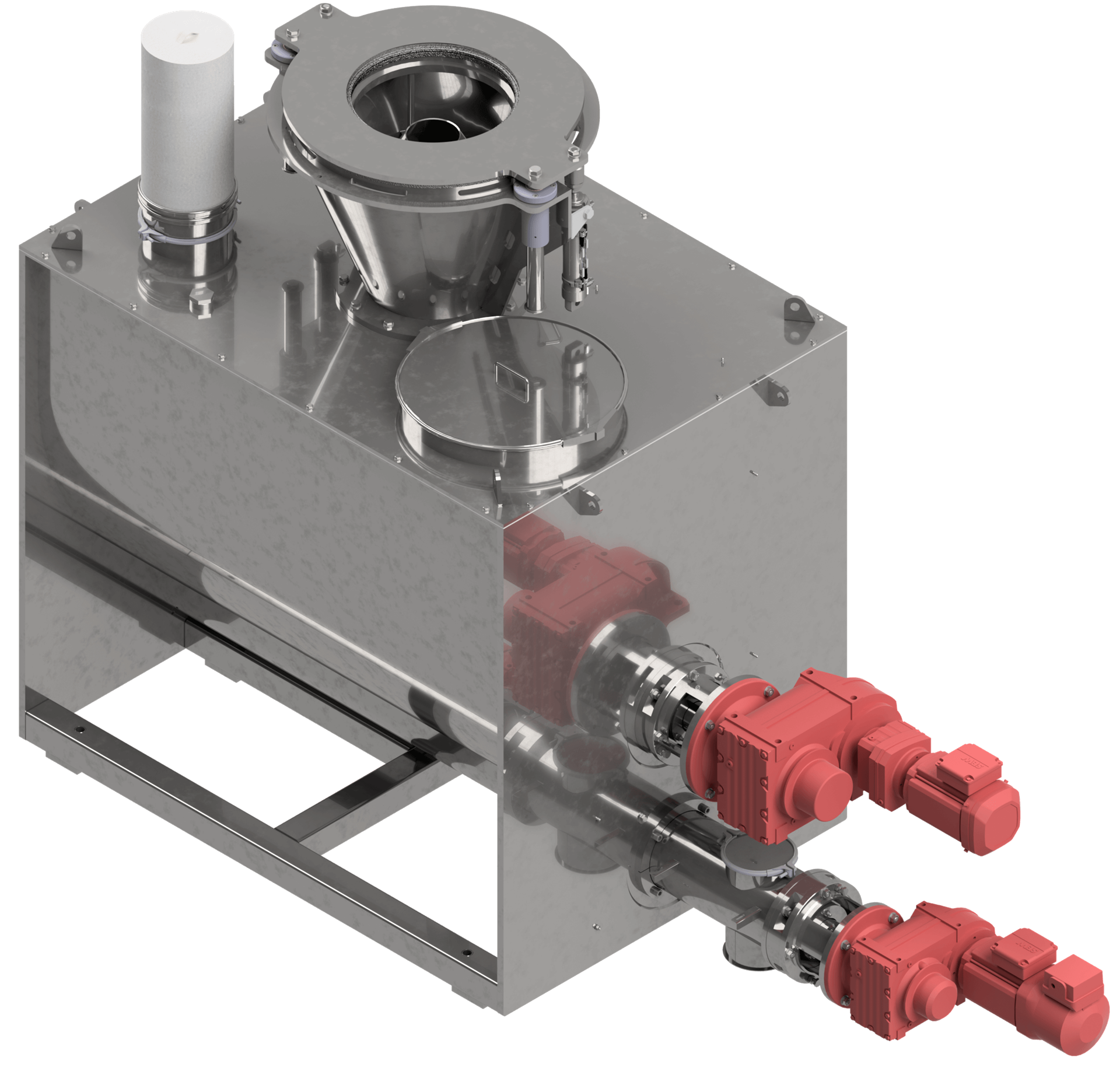 The dosing into the following process can be done either volumetric or gravimetric. With decoupling, e.g. rotary valve, the screw feeder can discharge into a pneumatic conveying system. An optional twin screw type is used in case of two separate discharge points.