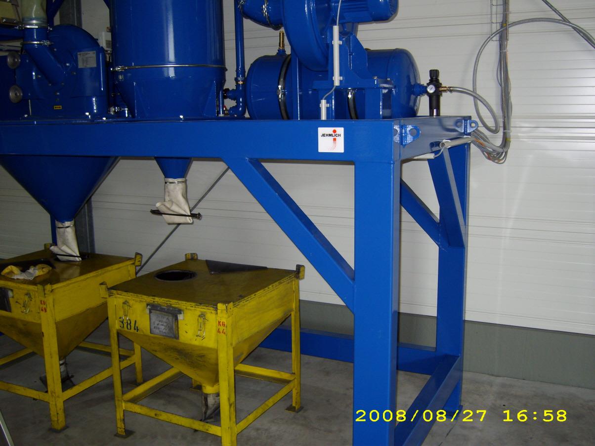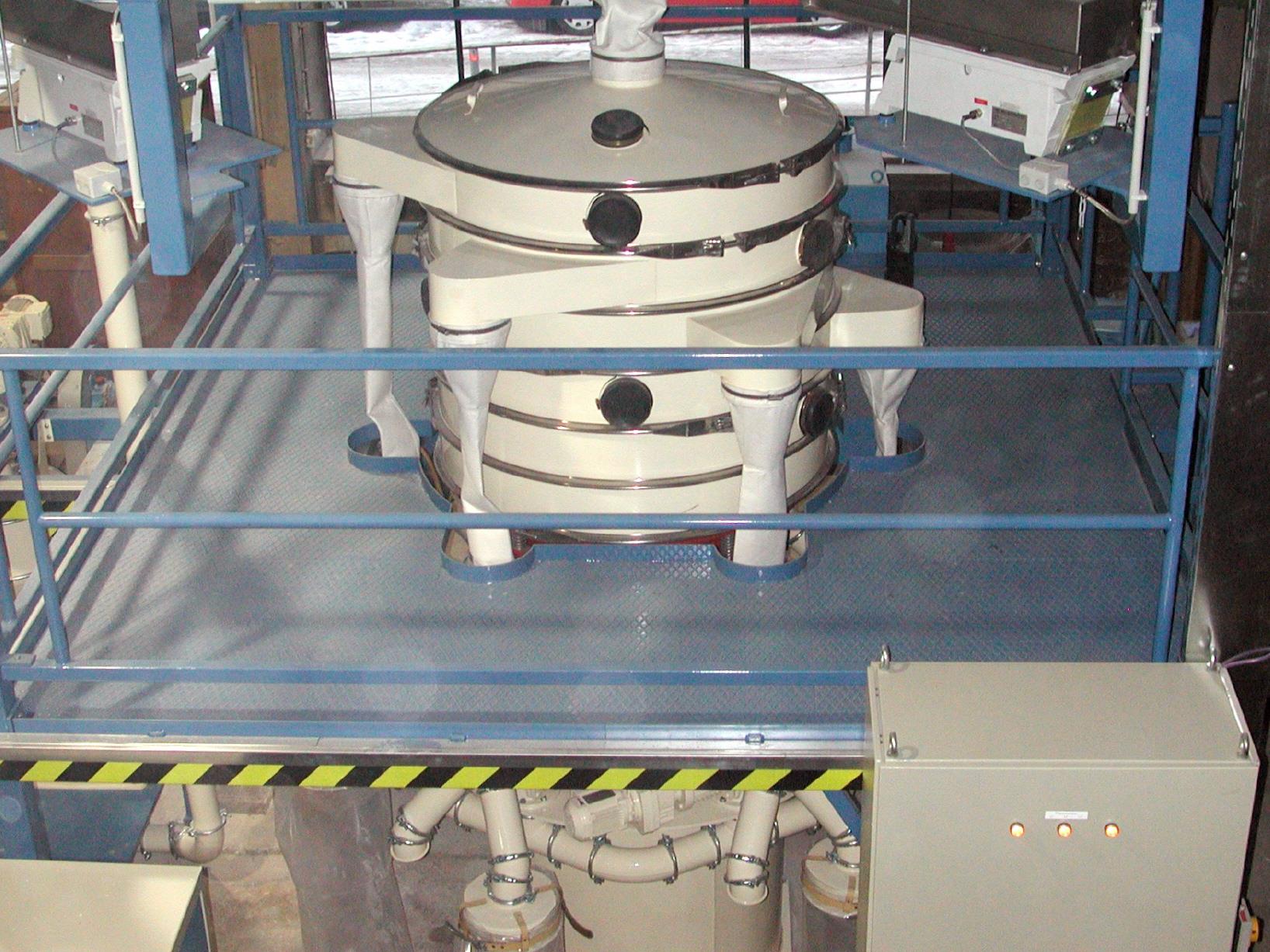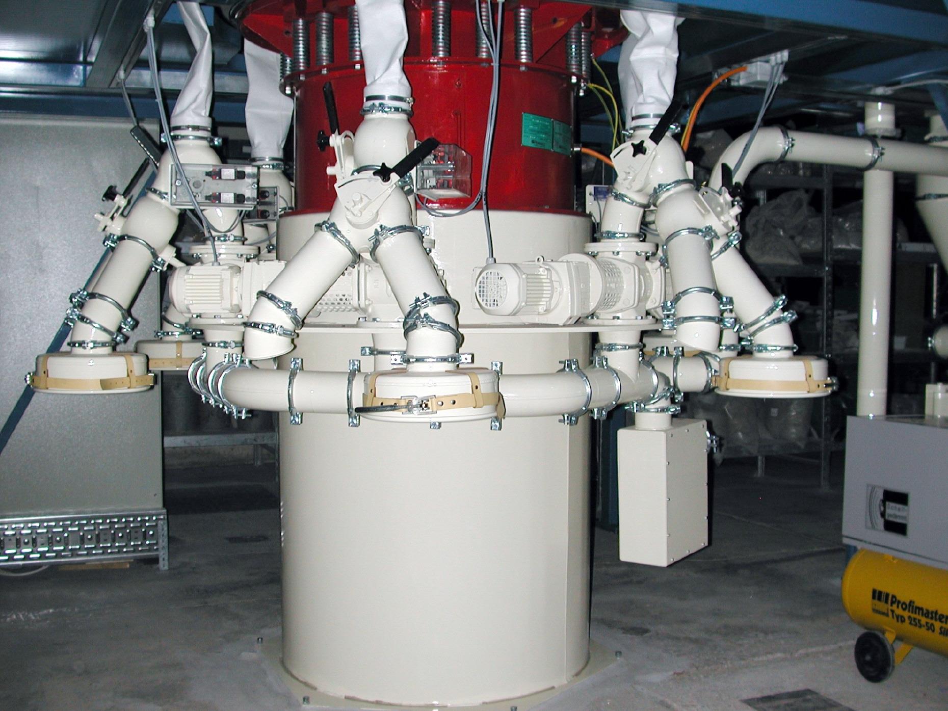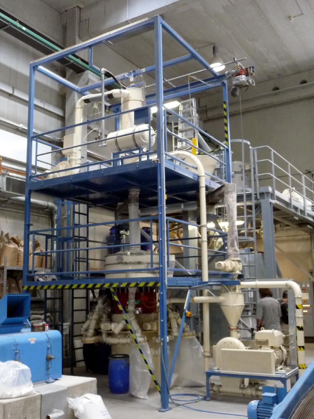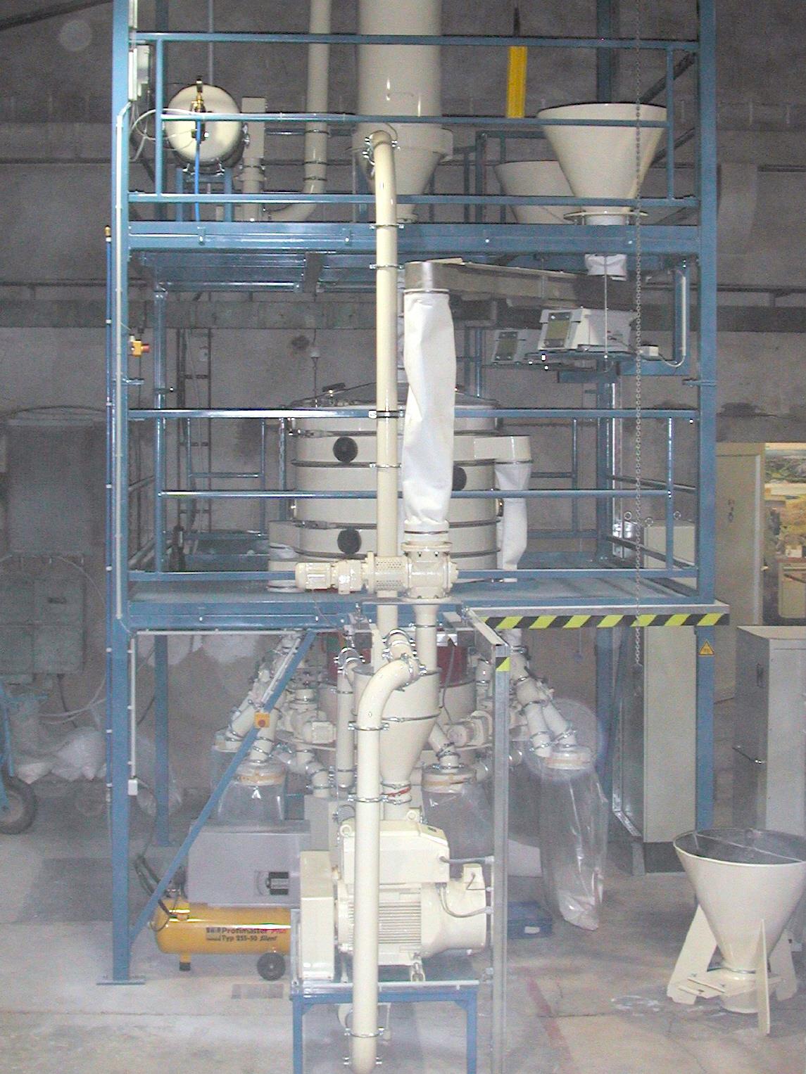 This fully automated grinding plant is used for pulverizing of polyethylene granules. A vacuum conveyor is feeding the grinding stock to the fluted-disk mill REKORD B-SM. The screening machine in the circulation system separates the coarse material to the mill for a re-grinding. The ground stock is collected in containers.