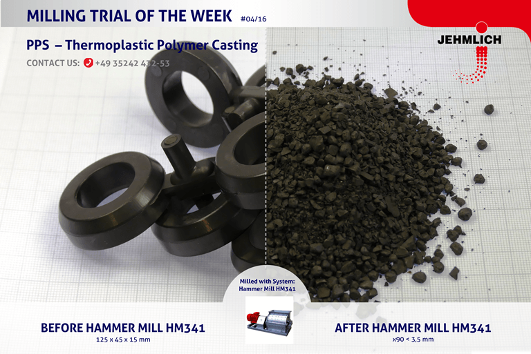 For recycling, highly resilient thermoplastic compound materials (here, a PPS / metal combination) are best opened up with the JEHMLICH hammer mill HM 341 and a suitable sieve grate insert. Check your equipment options for crushing approx. 250 kg/h of compound PPS materials with our heavy duty systems. Book your trials with us and ensure your desired product quality.